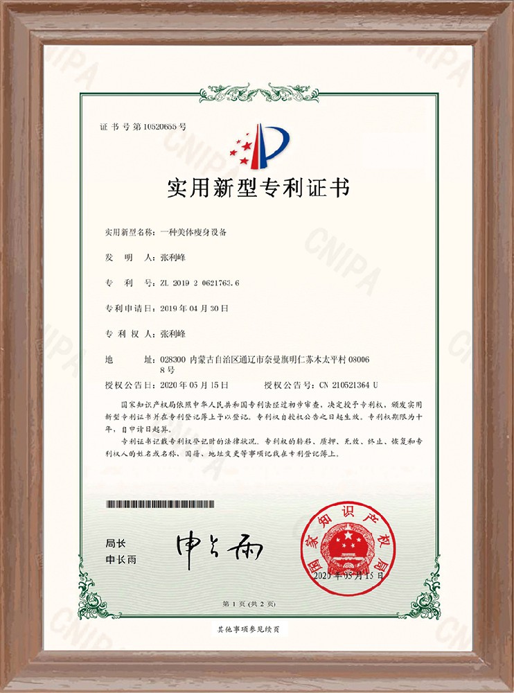 一种美体瘦身设备实用新型专利证书